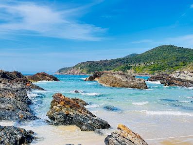 Sandy beach with rock pools in a scenic, secluded environment beneath a vegetation-covered bluff.