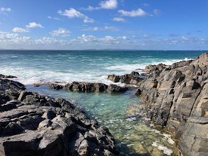Snorkeling in natural saltwater pools on a dramatic headland with a stone beach & coastal forest.
