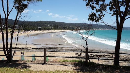 Sandy stretch popular for surfing, home to a restaurant pavilion & wellness center.