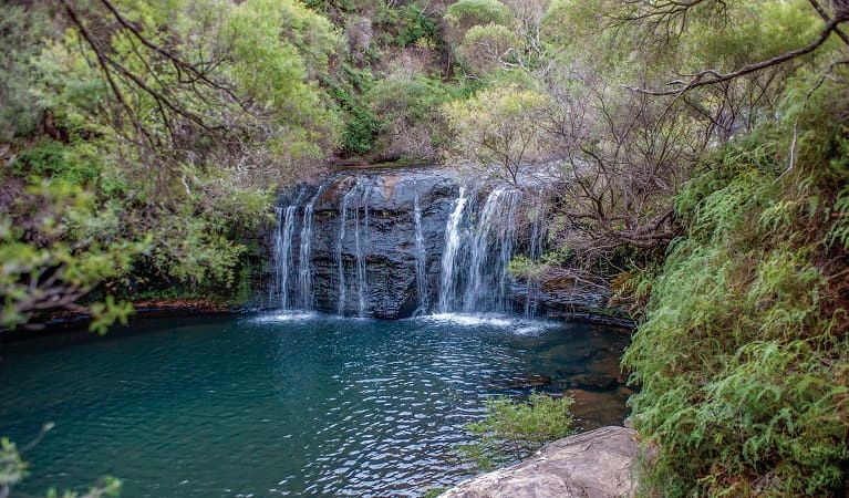 A fern-lined oasis with a large pool beneath a waterfall, perfect for cooling off and picnicking.