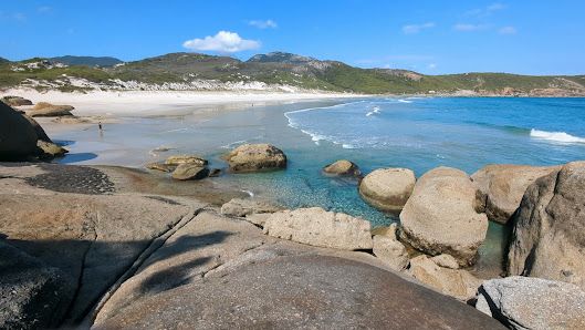 Pristine white beach with sand that squeaks underfoot, with rock formations, clear waters & surf.